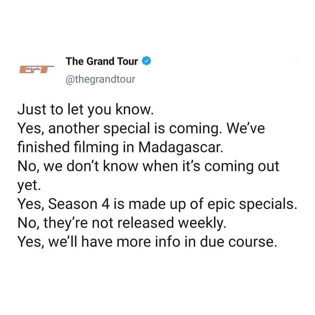 The twitter handle of the grand tour posted that shoot has been completed but still some editing is left. Episode 2 is shooted in Madagascar. Yes they also accepted that episodes will not come weekly like other previous seasons.